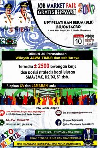 Kegiatan dengan tajuk “Job Market Fair 2017” akan diikuti 30 Perusahaan dari Wilayah seluruh Jawa Timur dan sekitarnya. adapun syarat mengikuti Job Fair kali ini, di buka untuk Masyarakat umum dengan mengirimkan Curiculum vitae (CV) atau Daftar Riwayat Hidup dan Surat Lamaran.