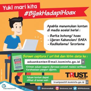 Dinas Komunikasi dan Informatika kini menyediakan aduan untuk penyebar hoax. dengan cara menscreen capture ur link dan mengirim data ke [email protected]. kiriman akan diproses melaui verifikasi, untuk pengirim akan dirahasiakan. (*)