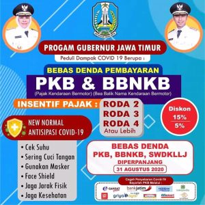 Gubernur Jawa Timur, Khofifah Indarparawansa dalam status facebooknya senin (03/08/2020) mengunggah ajakan kepada masyarakat di Jawa Timur memanfaatkan perpanjangan biaya bebas denda bagi pemilik kendaraan bermotor.