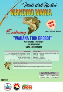 Deru – kimderumaju.com – Bagi anda yang hobi mancing jangan lewatkan momentum special ini. Mancing mania akan dilaksanakan pada hari sabtu (03/10) di embung Wahana Tjok Brosot Desa Deru Kecamatan Sumberrejo Kab. Bojonegoro.